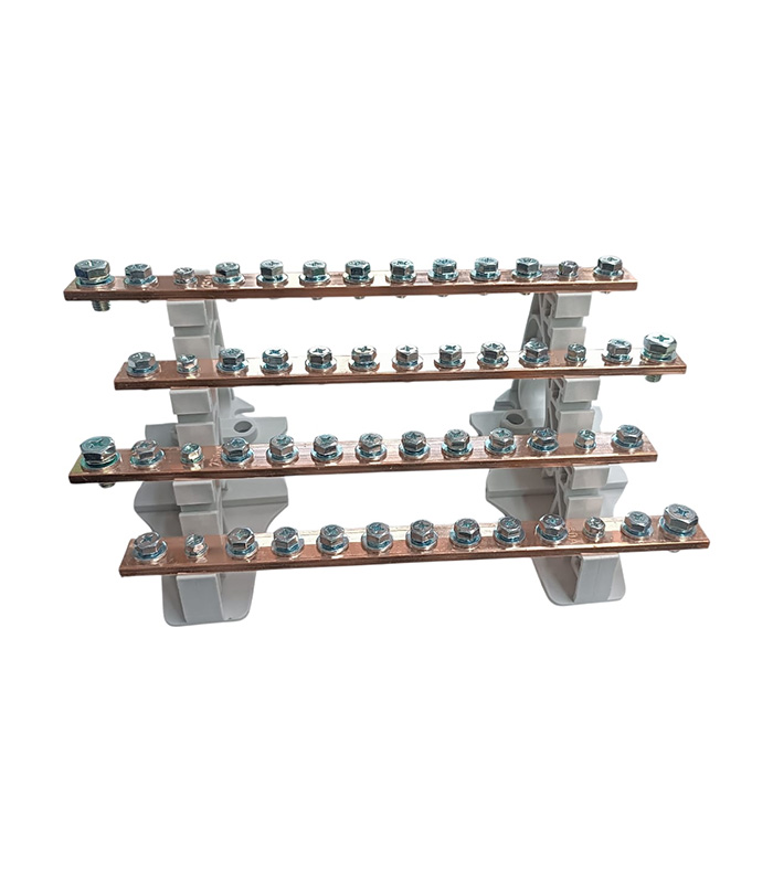 Il est équipé de 4 bornes en cuivre, chacune comportant 13 trous de connexion, permettant d’alimenter plusieurs circuits simultanément avec une répartition homogène du courant.